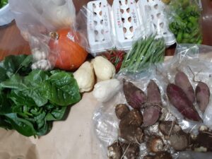 アラカルトセット(竹コース)のメニューの一例です。元気卵10×3、すだち、ししとう、さつまいも、里芋、つるむらさき、はやとうり、カボチャ、玉ねぎ、ニンニク、唐辛子、いんげん、その他、じゃがいも、なす、オクラも、選べます。送料込み5000円です。メニューも、気軽にご相談下さい!