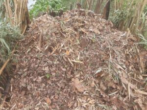垣根の落ち葉を、一通り集めたら、たちまち、堆肥枠いっぱいに、なりました。発酵させて、畑の土に、循環させていきます。