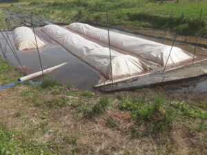 苗代に、畔シートで、土手を、作って、水を、入れています。保水性が、増して、すぐに、たっぷり取り入れられるように、なりました。早苗が、出たのを、確認できました。