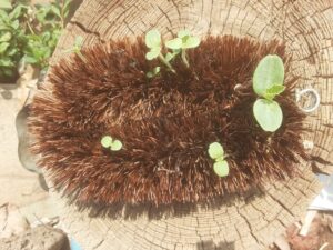 たわしに、ゴマと、冬瓜の芽が、出てきました。間に合いも、成長も、できませんが、野菜の生きる力を、感じます。