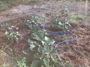 焼け石に水のような状況で、やれども、やれども、すぐに、干上がってしまうけど、ナスに、ひたすら、水を、あげています。この時期で、さほど、成長できず、実が、つかないのは、異例ですが、水やりを、続けます