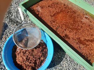 ゴマを洗って、干しています! Posted on 2021年11月3日2025年3月3日 by ninnjinnya 連日の晴れ予想で、温度も、低くからっとした陽気が続きそうなので、泥を落とし、比重選別するために、ゴマを洗って、乾かしています。 椎なが、4分の1くらい出て、貴重なゴマが、仕上がっていきます。 Published by ninnjinnya View all posts by ninnjinnya