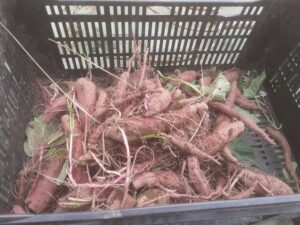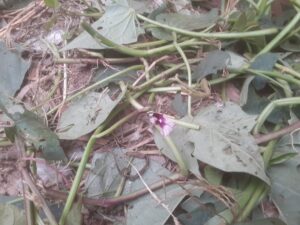 さつまいもを、掘り始めました。この時期に、掘って、このサイズです。典型的な蔓ボケです。繁茂した葉への栄養成長で、実が、大きくなれずに、終わりました。酷暑で、つる返しできず仕舞いでした。葉を、鶏に、あげることに、します。珍しいさつまいもの花が、見られました。