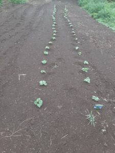 いんげんも、列を、なして、気持ち良く、生え揃ってきました。
