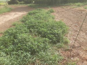 成長まっしぐらの落下生のつまみ食いするカラス対策に、テグスを、しました。カラスは、来なくなりました。