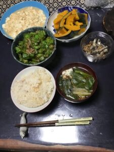 我が家のごはんは、野菜中心です。霜が、降りる前のししとうのじゃこ煮と、長ネギとナスの味噌汁に、豆腐工房わたなべさんお豆腐と卵を、醤油と蜂蜜で、甘じょっぱく炒めたものに、かぼちゃの煮付けです。美味しいです。