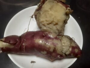 寸胴サイズの大きめな芋を、30分ぐらい煮て、ホクホクとしたのを、食べます。我が家の愛犬クロに、あげると、大好物なので、大喜びです。
