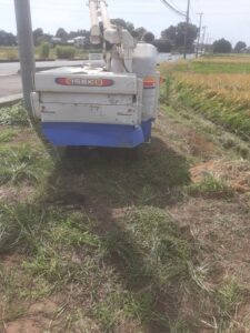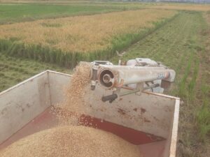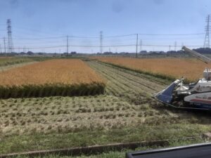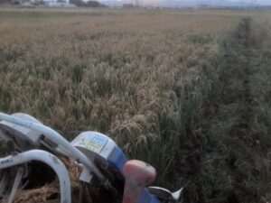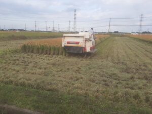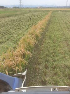 順調に、行くと思いきや、水が、思いの外、残っていて、小さなコンバインで、はまってしまいました。乾くのを、待って、再開します。わずかの作付けですが、お米は、貴重だと、実感します。