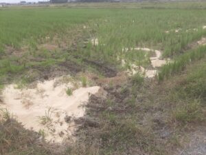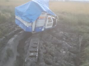キャタピラーに、アルミブリッジを、かけて、何とか脱出できました。田んぼが、乾いたら、改めて、稲刈りを、終えます。