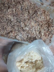 米糠に、えひめAIという微生物たっぷりのエキスを、まぶして、おからを、混ぜて、自家製配合飼料を、作って、育てています。冬場は、2-3日したら、発酵熟成して、ホカホカとした湯気が、立ち、パンのような芳醇な香りが、出来上がりを、知らせてくれます。